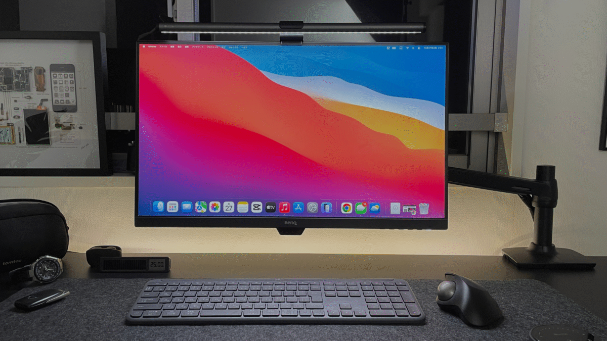 このモニターを、先に紹介した昇降式デスク+モニターアーム環境に組み込んで使用しています。27インチ表示のおかげで、資料や複数ウィンドウを開いての作業が快適になりました。